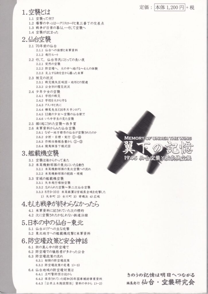 戦後70年にあたる2015年,仙台・空襲研究会では仙台空襲についてまとめ直した冊子「翼下の記憶 - 1945 仙台空襲と艦載機空襲」を出版しました.