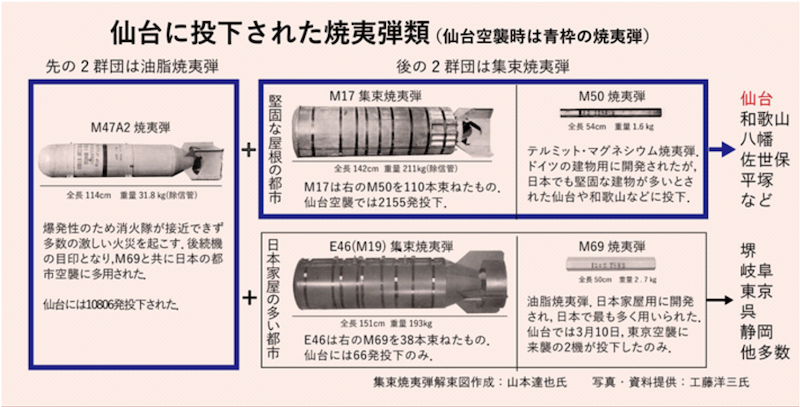 仙台を空襲した第58航空団が搭載したのは,500ポンドのAN-M17A1集束焼夷弾1,100ポンドのAN-M47A2焼夷弾2,M-46写真用照明弾3です.