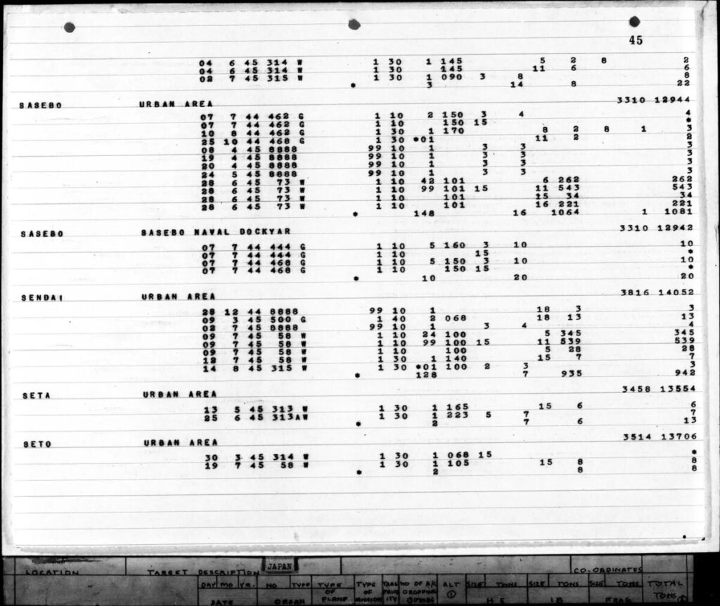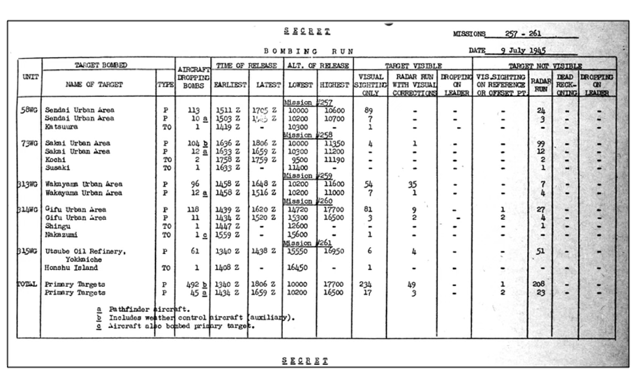空襲の基本的な資料である「作戦任務報告書」の集約統計表から,B-29による空襲の目標・機数・攻撃時間・投下爆弾の種類を見てみましょう.